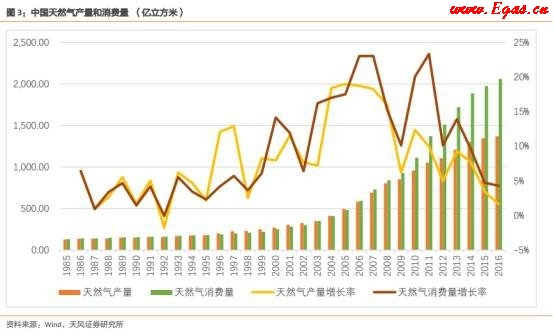 2016年中國天然氣消費量2058億立方米,產(chǎn)量1368億立方米,供需缺口近700億立方米,對外依存度34%。自2014年起,中國天然氣的產(chǎn)量和消費量增速均有所放緩,但消費量的增速仍然持續(xù)大于產(chǎn)量的增速。隨著中國城鎮(zhèn)化過程中居民能源消費結(jié)構(gòu)的變化,以及環(huán)保監(jiān)管日趨嚴格的背景下燃氣替代煤炭供電供熱需求的提升,天然氣下游消費有進一步增長的空間。開發(fā)國內(nèi)非常規(guī)天然氣、進口管道氣、進口LNG是解決中國天然氣供需缺口的三大主要途徑。