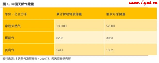 截至2015年底,全國累計探明常規(guī)天然氣地質(zhì)儲量13.01萬億立方米,剩余可采儲量5.2萬億立方米;累計探明煤層氣地質(zhì)儲量6293億立方米,剩余可采儲量3063億立方米;累計探明頁巖氣地質(zhì)儲量5441億立方米,剩余可采儲量1302億立方米。