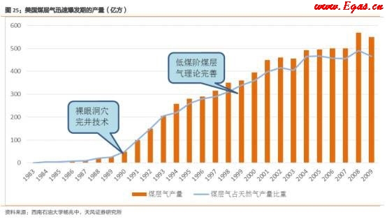 從歷史角度看,美國(guó)的頁(yè)巖氣產(chǎn)量在取得大突破之前經(jīng)歷了漫長(zhǎng)的積淀和等待,僅頁(yè)巖氣商業(yè)化開采利用的歷史就有80多年。當(dāng)然,若不考慮商業(yè)因素,僅考慮生產(chǎn)因素,那么頁(yè)巖氣開發(fā)的歷史則更長(zhǎng)?,F(xiàn)實(shí)當(dāng)中的"頁(yè)巖氣革命"是偶然當(dāng)中的必然,并非一朝一夕所能完成。而我國(guó)煤層氣的開發(fā)是從1980年左右開始的,直至2002年之前,基本處于地質(zhì)尋證,勘探找氣,開發(fā)摸索的階段。