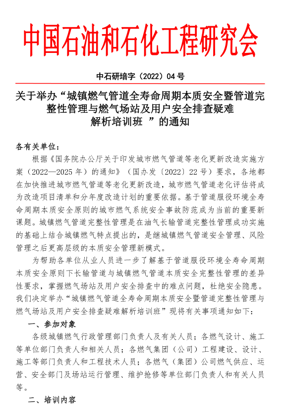 為幫助各單位從業(yè)人員進(jìn)一步了解基于管道服役環(huán)境全壽命周期本質(zhì)安全原則下長輸管道與城鎮(zhèn)燃?xì)夤艿辣举|(zhì)安全完整性管理的差異性要求,掌握燃?xì)鈭稣炯坝脩舭踩挪橹械碾y點(diǎn)問題,杜絕安全隱患。我們決定舉辦“城鎮(zhèn)燃?xì)夤艿廊珘勖芷诒举|(zhì)安全暨管道完整性管理與燃?xì)鈭稣炯坝脩舭踩挪橐呻y解析培訓(xùn)班”現(xiàn)將有關(guān)事項(xiàng)通知如下: