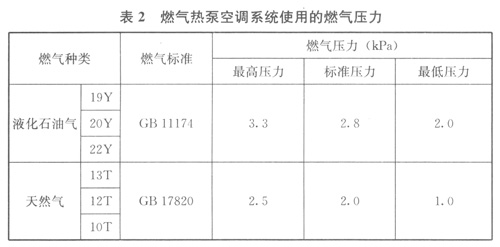 225現(xiàn)行國(guó)家標(biāo)準(zhǔn)《燃?xì)獍l(fā)動(dòng)機(jī)驅(qū)動(dòng)空調(diào)(熱泵)機(jī)組》GBT 22069—2008中第612條規(guī)定了燃?xì)鉄岜每照{(diào)機(jī)組使用的燃?xì)鈮毫θ绫?/span>2所示。