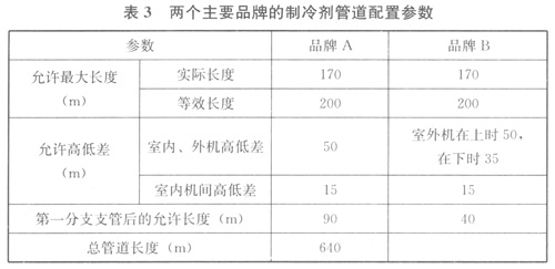 室內(nèi)、外機(jī)之間以及室內(nèi)機(jī)之間的最大管長(zhǎng)最大高差,是燃?xì)鉄岜每照{(diào)系統(tǒng)的重要性能參數(shù),為保證系統(tǒng)運(yùn)行安全、穩(wěn)定、高效,在設(shè)計(jì)時(shí),系統(tǒng)的最大管長(zhǎng)與最大高差不應(yīng)超過所選用產(chǎn)品的技術(shù)要求。表3列出了兩個(gè)主要品牌的相關(guān)技術(shù)要求。
