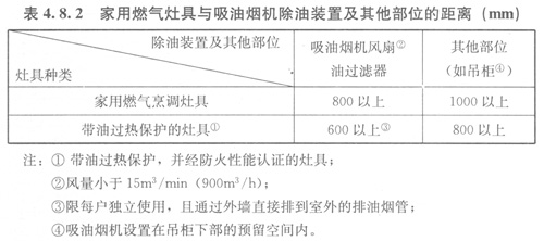 4.8.2家用燃氣灶具與上方吸油煙機除油裝置及其他部位的距離宜按表4.8.2的規(guī)定執(zhí)行,家用燃氣灶具與側(cè)吸式吸油煙機除油裝置的距離可按本規(guī)程第4.8.1條的規(guī)定執(zhí)行。