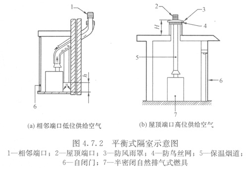 4.7.1當半密閉自然排氣式燃具安裝部位臨近較高建筑或用氣建筑較高造成煙道過長無法安裝時,或用戶需要的燃具熱負荷大于35kW時,可設置平衡式隔室,并將半密閉自然排氣式燃具安裝在平衡式隔室內(nèi)。