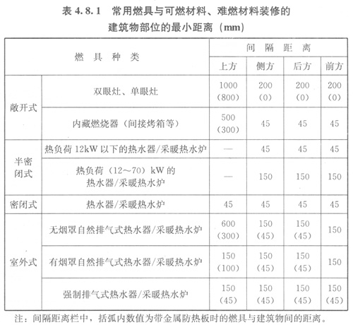4.8.1常用燃具與可燃材料、難燃材料裝修的建筑物部位的最小距離宜符合表4.8.1的規(guī)定。