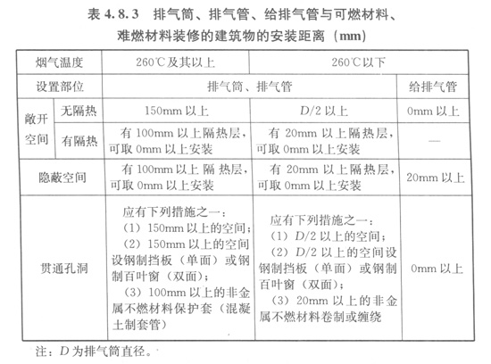 4.8.3排氣筒、排氣管、給排氣管與可燃材料、難燃材料裝修的建筑物的安裝距離應符合表4.8.3的規(guī)定。