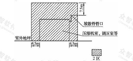 建筑物內(nèi)部及建筑物外壁4.5m內(nèi),屋頂(以放散管管口計(jì))以上7.5m內(nèi)的范圍為2區(qū)。