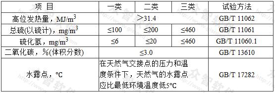 1)天然氣發(fā)熱量、總硫和硫化氫含量、水露點(diǎn)指標(biāo)應(yīng)符合現(xiàn)行國家標(biāo)準(zhǔn)《天然氣》GB17820的一類氣或二類氣的規(guī)定;