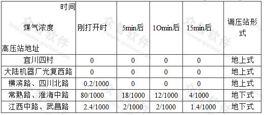 原上海市煤氣公司曾用“臭敏檢漏儀”對(duì)調(diào)壓站室內(nèi)煤氣(人工煤氣)濃度進(jìn)行測(cè)定,在正常情況下(通風(fēng)換氣為每小時(shí)2次),地上調(diào)壓站室內(nèi)空氣中的煤氣含量是極少的,詳見(jiàn)表35。