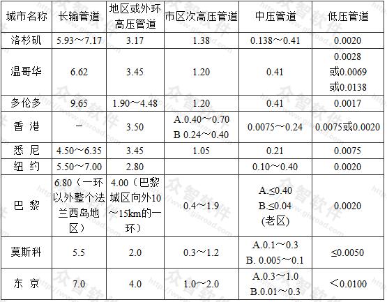 據(jù)西氣東輸長(zhǎng)輸管道壓力工況,壓縮機(jī)出口壓力為10.0MPa,壓縮機(jī)進(jìn)口壓力為8.0MPa,這樣從輸氣干線引支線到城市門站,在門站前能達(dá)到6.0MPa左右,為城鎮(zhèn)提供了壓力高的氣源。提高輸配管道壓力,對(duì)節(jié)約管材,減少能量損失有好處;但從分配和使用的角度看,降低管道壓力有利于安全。為了適應(yīng)天然氣用氣量顯著增長(zhǎng)和節(jié)約投資、減少能量損失的需要,提高城市輸配干管壓力是必然趨勢(shì);但面對(duì)人口密集的城市過(guò)多提高壓力也不適宜,適當(dāng)?shù)靥岣邏毫σ赃m應(yīng)輸配燃?xì)獾囊螅帜軓陌踩系玫奖U?,使二者能很好地結(jié)合起來(lái)應(yīng)是要點(diǎn)。參考和借鑒發(fā)達(dá)國(guó)家和地區(qū)的經(jīng)驗(yàn)是一途徑。一些發(fā)達(dá)國(guó)家和地區(qū)的城市有關(guān)長(zhǎng)輸管道和城市燃?xì)廨斉涔艿缐毫η闆r如表23。