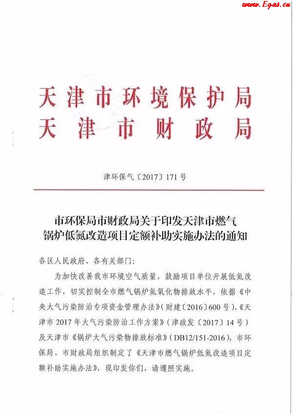為加快改善我市環(huán)境空氣質(zhì)量,鼓勵(lì)項(xiàng)目單位開(kāi)展低氮改造工作,切實(shí)控制全市燃?xì)忮仩t氮氧化物排放水平,市環(huán)保局、市財(cái)政局共同出臺(tái)了《天津市燃?xì)忮仩t低氮改造項(xiàng)目定額補(bǔ)助實(shí)施辦法》。自即日起,符合條件的燃?xì)忮仩t低氮改造項(xiàng)目單位可申請(qǐng)補(bǔ)助資金。