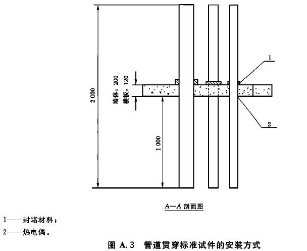 A.5 試驗時將管道封堵材料用金屬膨脹螺栓等金屬件固定在結(jié)構(gòu)厚度為120mm的現(xiàn)澆整體式C30砼樓板下(砼板受火面保護層厚度為10mm)或厚度為200mm砼墻體受火面一側(cè)。試驗用塑料管材總長度為2000mm,背火面塑料管材露出樓板或墻體長度為1000mm,受火面管口用同材質(zhì)堵頭或礦物棉封堵,封堵長度為(50±10)mm,背火面試驗管距管口50mm處用支承件固定。在背火面距樓板或墻體25mm處管外表面對稱兩側(cè)各安裝1支熱電偶。