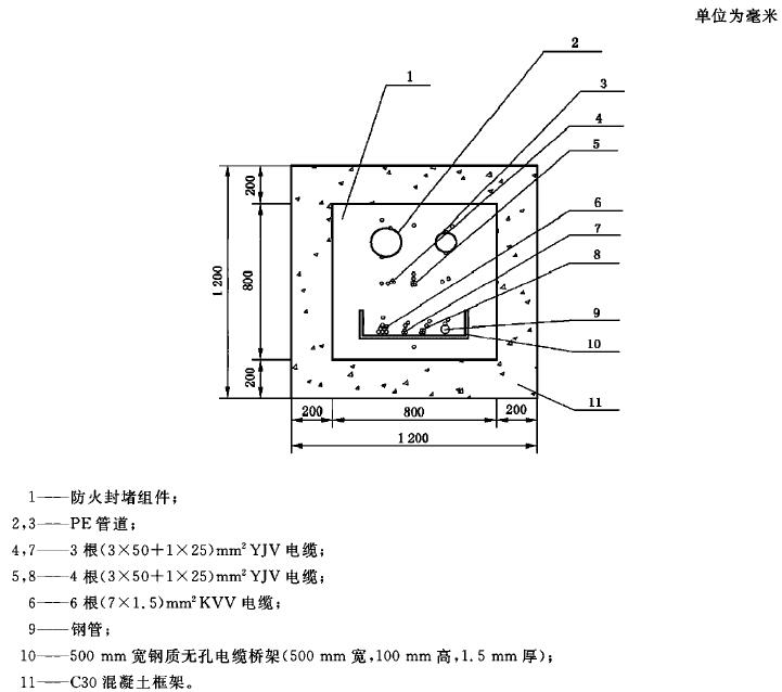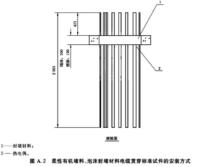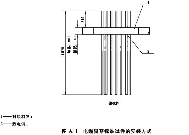 A.10 在電纜貫穿標準試件和防火封堵組件標準試件的防火封堵材料表面,距離每種貫穿物25mm處各布置一支熱電偶。在每種貫穿物表面距背火面25mm處布置一支熱電偶。當貫穿物背火面作了絕熱處理或有涂層時,在貫穿物上距離絕熱層或涂層邊緣25mm處布置熱電偶。其他任何可疑點均可設(shè)置熱電偶。