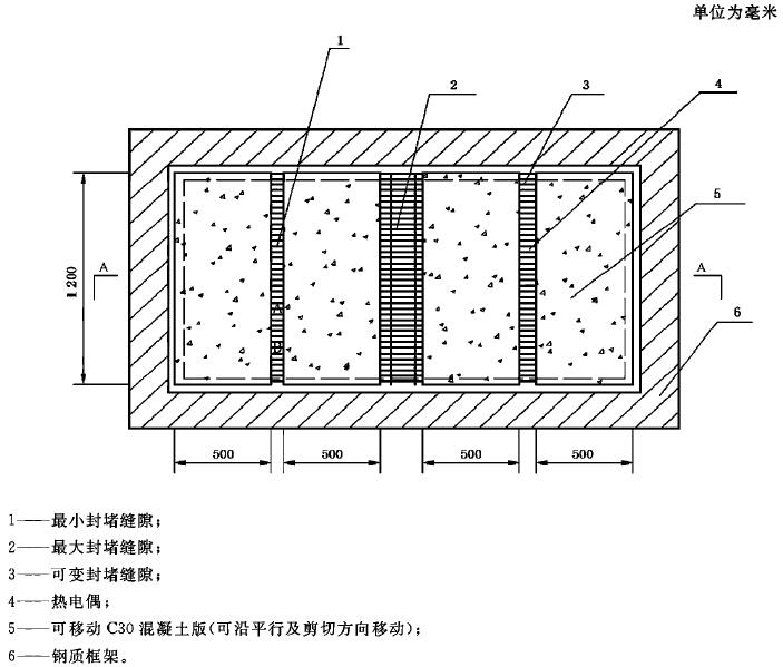 A.7 框架內(nèi)用于支撐縫隙的板材為C30混凝土板(砼板受火面保護層厚度為10mm)。對于縫隙封堵材料,可根據(jù)委托方的要求,在實施耐火試驗前或試驗過程中采用機械的方式移動縫隙,移動方式可以是沿被支撐的平面移動縫隙的寬度,也可以是沿剪切方向或其他方向移動,移動的最大距離應(yīng)根據(jù)縫隙封堵材料的性能由委托方確定。