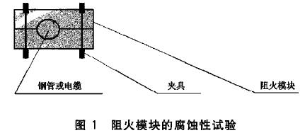 分別取長為250mm、外徑為Φ30mm~Φ40mm的Q235普通碳素結(jié)構(gòu)鋼管兩根和長為250mm、外徑為Φ30mm~Φ40mm的PVC絕緣護套電纜3根,在阻火模塊上鉆出與鋼管和電纜直徑相同的孔洞,并對剖。將鋼管和電纜置于阻火模塊的孔洞中,并用夾具固定,固定方式見圖1。七天后,觀察鋼管和電纜外層膠皮與堵料試樣接觸部位是否出現(xiàn)銹蝕、腐蝕現(xiàn)象。