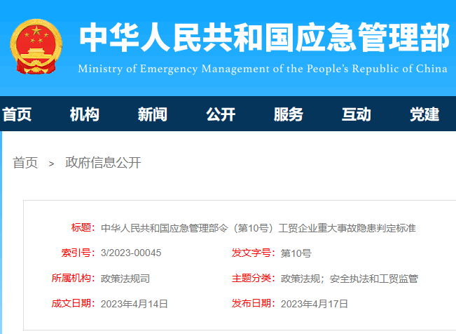 《工貿(mào)企業(yè)重大事故隱患判定標準》已經(jīng)2023年3月20日應急管理部第7次部務會議審議通過,現(xiàn)予公布,自2023年5月15日起施行。