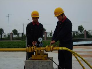(圖三)運(yùn)輸壓縮天然氣的槽車到站區(qū)就位。卸車前關(guān)閉CNG站內(nèi)及卸車柱上所有閥門,操作人員必須使用防爆工具。