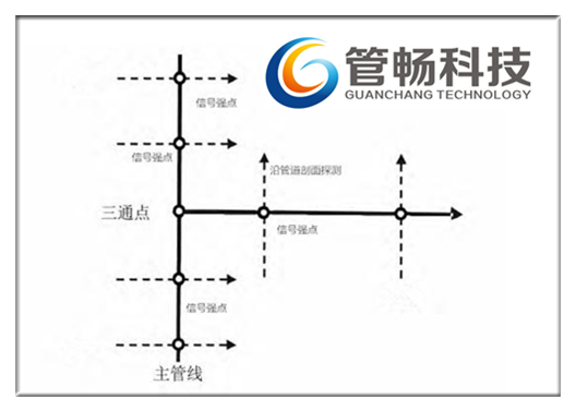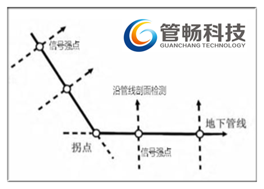 探測三通點時,也可采用間接的幾何交匯法;當我們發(fā)現疑似三通位置時(通常在遇到三通時,三通位置信號會異常強烈),在與主管線垂直方向3米以外橫切探測,找出信號最強的一個點后,在其延伸方向再找出第二個信號最強點,兩點連成一條直線,用交匯法就可以定出三通點的位置。
