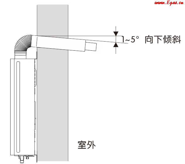 • ⑤ 排煙管應(yīng)有朝外向下1~5°的角度,以利于冷凝水流出;通過(guò)可燃?jí)Ρ跁r(shí),應(yīng)有≥20mm厚度絕緣材料分隔及覆蓋;