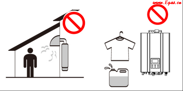 • ② 熱水器切勿安裝在浴室內(nèi)(平衡機(jī)除外),在車輛、船只上,切勿將熱水器暗裝。