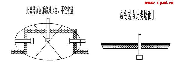 • ③ 排煙口不得安裝在樓房的換氣風(fēng)道或公共煙道上;排煙孔位置應(yīng)避開(kāi)墻面易形成正壓區(qū)的凹形區(qū)。