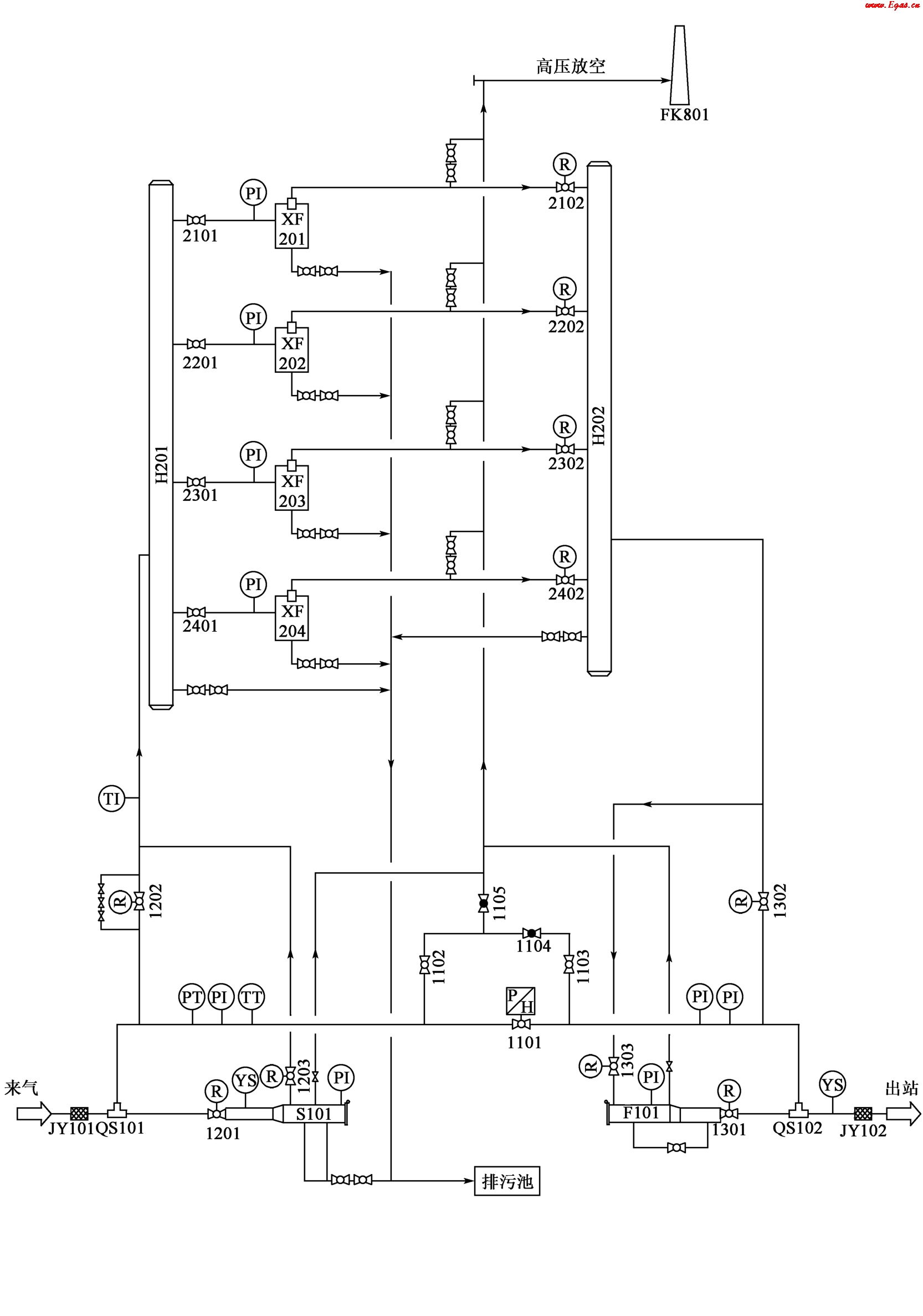 清管站的功能就是收發(fā)清管器。長(zhǎng)輸管道的清管作業(yè)有投產(chǎn)前清管和正常運(yùn)行期間清管。投產(chǎn)前清管的主要目的是清除管道內(nèi)雜質(zhì),主要包括施工期間的泥土、焊渣、水等。正常運(yùn)行期間的清管是指管道運(yùn)行一段時(shí)間后,由于氣體內(nèi)含有一定的雜質(zhì)積存在管線內(nèi),使管輸效率下降,對(duì)管線造成腐蝕等,因此需要對(duì)管線進(jìn)行清管。常見清管站工藝流程圖,如圖3-1所示。
