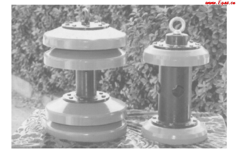 圖12-7為管道清管器用皮碗和鋼刷。直型皮碗主要用于雙向直型清管器中,皮碗的直徑大于管道的內(nèi)徑,靠彈性力保持清管器前后的密封,這種密封條件會很快地隨磨損而喪失,所以直型皮碗的使用壽命比碟型皮碗短。變徑皮碗實(shí)為直型皮碗的一種形式,主要用于變徑管道的清掃。碟型皮碗具有更好的密封性能,有深碟和淺碟之分,同時(shí)還可在皮碗上加鋼釘增加清掃效果。鋼刷應(yīng)可與皮碗進(jìn)行良好的互換,在管道清掃過程中,對管道的除銹、除垢具有良好的清掃效果。