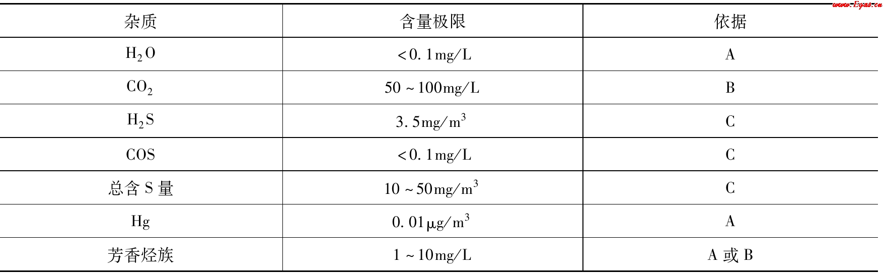 在進(jìn)行天然氣液化之前,必須將天然氣中的酸性氣體和雜質(zhì)如H2S、CO2、H2O、Hg等進(jìn)一步去除,以免它們?cè)诘蜏叵聝鼋Y(jié)而堵塞、腐蝕設(shè)備和管道,并提高產(chǎn)品的純度。表2-1列出了基地型LNG工廠天然氣預(yù)處理標(biāo)準(zhǔn)和雜質(zhì)的最大允許含量。