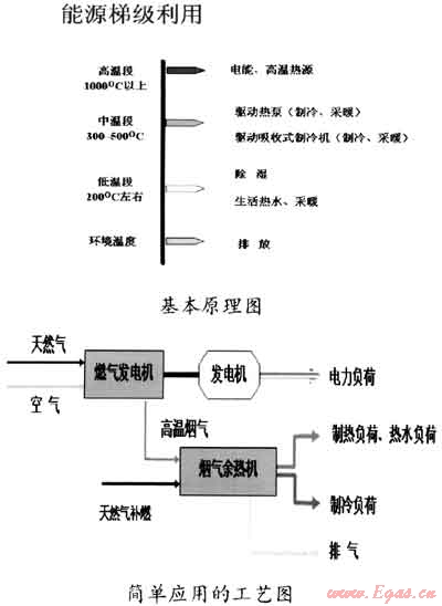 根據(jù)“高能高用、低能低用、溫度對(duì)口、梯度利用”的原理,對(duì)天然氣燃燒產(chǎn)生的高溫?zé)煔猓ㄟ^發(fā)電機(jī)來提供高品位的電能,對(duì)發(fā)電機(jī)排出的煙氣,根據(jù)用戶的需求,或產(chǎn)生蒸汽、熱水,或轉(zhuǎn)換成冷能,或用于除濕,從而將天然氣所含的能量盡可能地“吃盡榨干”,從而實(shí)現(xiàn)能源的高效利用,同時(shí)也達(dá)到較好的經(jīng)濟(jì)性。