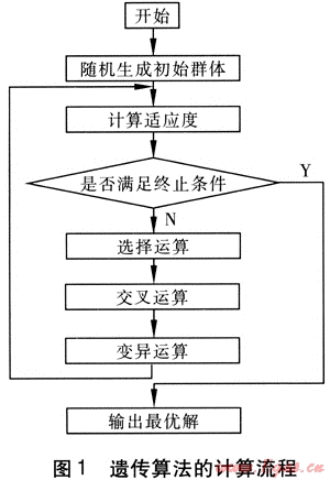 遺傳算法作為一種全局優(yōu)化搜索方法,以其簡單通用、魯棒性強(qiáng)、適于并行處理以及應(yīng)用范圍廣等特點(diǎn),在求解復(fù)雜的工程優(yōu)化問題中取得了良好的效果。它是基于生物進(jìn)化的思想,將優(yōu)化計(jì)算中的迭代過程模擬成物種進(jìn)化的過程,形成一種具有“生成+檢驗(yàn)”特征的搜索算法[5]。它以編碼空間代替問題的參數(shù)空間,以適應(yīng)度函數(shù)為評價(jià)依據(jù),以編碼群體為進(jìn)化基礎(chǔ),以對群體中個(gè)體位串的遺傳操作實(shí)現(xiàn)選擇和遺傳機(jī)制,建立起一個(gè)迭代過程,使遺傳算法具有了其他傳統(tǒng)優(yōu)化方法所沒有的特性。遺傳算法的計(jì)算流程見圖1。
