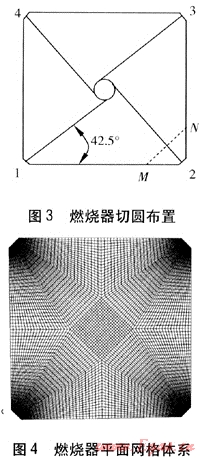 燃燒器切圓布置見圖3,從左下角逆時(shí)針旋轉(zhuǎn),燃燒器編號(hào)依次為1~4號(hào)角,1~4號(hào)角射流方向與前墻夾角均為42.5°,圖中虛線MN為計(jì)算結(jié)果分析時(shí)的輔助線。由于四角切圓鍋爐幾何區(qū)域的復(fù)雜性,采用直角坐標(biāo)系進(jìn)行數(shù)值計(jì)算時(shí),其每個(gè)角上的一二次風(fēng)的入口方向與直角坐標(biāo)的網(wǎng)格邊界的夾角約為45°,這就容易產(chǎn)生數(shù)值偽擴(kuò)散[4],影響計(jì)算的準(zhǔn)確性。為減小偽擴(kuò)散,本文采用平面網(wǎng)格體系(見圖4)。爐內(nèi)計(jì)算區(qū)域采用了六面體網(wǎng)格,由圖4可知,燃燒器噴口附近的節(jié)距較小,并呈輻射狀,以適應(yīng)燃燒器射流的發(fā)展,盡可能使流體流動(dòng)方向與網(wǎng)格邊界的夾角遠(yuǎn)離45°,最大限度地以垂直于網(wǎng)格邊界的方向進(jìn)入計(jì)算微元體。