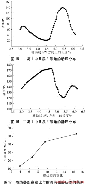 工況1中B層2號(hào)角的動(dòng)壓分布見圖15,在輔助線MN方向上的長(zhǎng)度為5.4m時(shí),動(dòng)壓達(dá)到最大,可以判斷這是燃燒器噴口噴出的射流中心所在的位置。工況1中B層2號(hào)角的靜壓分布見圖16,在輔助線MN方向上的長(zhǎng)度為5.4m的兩側(cè),靜壓分別有兩個(gè)高峰值,這兩個(gè)峰值之差即為燃燒器噴口噴出的射流中心兩側(cè)的靜壓差,約32Pa。通過此種方法,可以計(jì)算出所有燃燒器射流中心兩側(cè)的靜壓差。各工況燃燒器射流中心兩側(cè)靜壓差平均值見表2,這里的平均靜壓差為各工況下所有燃燒器射流中心兩側(cè)靜壓差的算術(shù)平均值。由表2可知隨著高寬比的增加,燃燒器射流中心兩側(cè)平均靜壓差逐漸增大。
