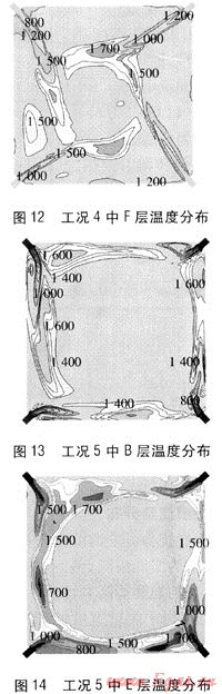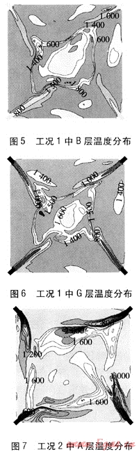 ⑤ 工況5中所有噴口全開,這時(shí)燃燒器的高寬比達(dá)到16.55。計(jì)算結(jié)果顯示,實(shí)際切圓直徑過大,氣流從燃燒器噴出后直接沖刷爐壁,由圖13、14可知,燃燒器平面的高溫區(qū)域均在壁面附近,這樣會(huì)在爐壁附近形成還原性氣氛,降低了灰熔點(diǎn),運(yùn)行中容易造成爐壁的結(jié)渣。