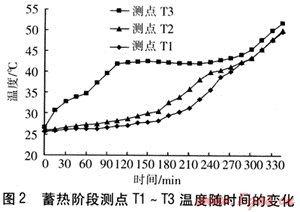 工作電壓為8V,余熱熱源溫度為32℃時(shí),蓄熱階段測點(diǎn)T1~T3溫度隨時(shí)間的變化見圖2。由圖2可知,在蓄熱開始時(shí)期,測點(diǎn)T3處的石蠟吸收熱量后溫度有明顯的升高。在達(dá)到相變溫度(35℃)前,石蠟主要呈固態(tài),石蠟從熱管壁吸收的熱量主要用于其自身溫度的提高,以顯熱的形式儲(chǔ)熱。