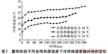 根據(jù)熱電熱泵原理,冷熱端溫差對熱電熱泵制熱性能有重要影響,冷熱端溫差越小,制熱性能系數(shù)越大。余熱熱源溫度的改變使得冷端的換熱條件發(fā)生改變,這也必將改變熱電熱泵相變蓄熱裝置的冷熱端溫差,進(jìn)而影響熱電熱泵的制熱性能。蓄熱階段,不同余熱熱源溫度下冷熱端溫差隨時(shí)間的變化見圖3。由圖3可知,余熱熱源溫度越高,冷熱端溫差越小。