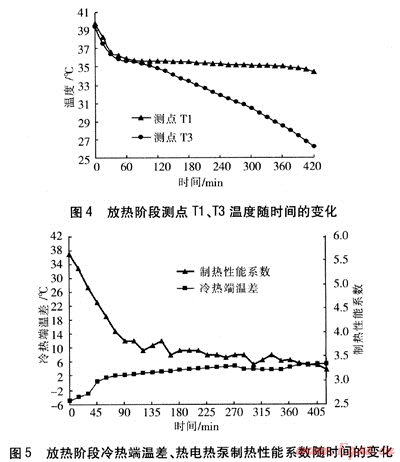 放熱階段冷熱端溫差、熱電熱泵制熱性能系數(shù)隨時(shí)間的變化見圖5。