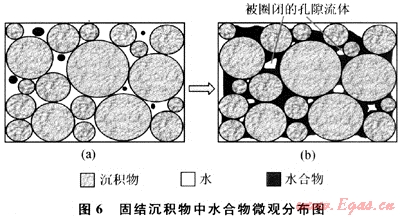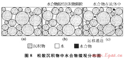 水合物的微觀分布對沉積物內(nèi)氣體運移通道具有重要影響:在固結沉積物中,水合物在飽和度大于30%后膠結沉積物顆粒,使沉積孔隙中部分流體被“封閉”,得不到氣源的供給而不能進一步生成水合物;而在松散沉積物中,大部分水合物因在孔隙流體中生成(只有最初1%飽和度的水合物膠結沉積物顆粒),未堵塞流體運移通道,因此水合物幾乎能完全充填孔隙。