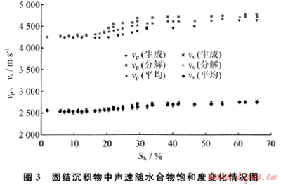 水合物的微觀分布對沉積物的聲學性質(zhì)具有重要影響:在固結沉積物中,由于在孔隙流體中生成,0~10%飽和度的水合物對聲速影響甚小;在松散沉積物中,由于水合物膠結沉積物顆粒生成,微量的水合物(飽和度1%左右)使縱波速度陡增。這表明,了解水合物的微觀分布對水合物資源估算具有重要的指導作用。