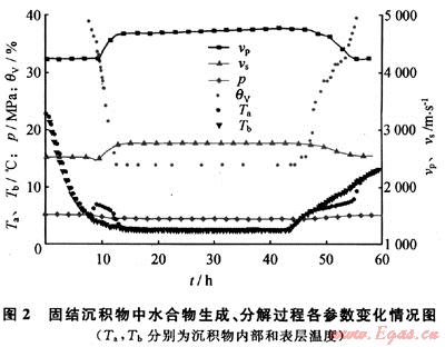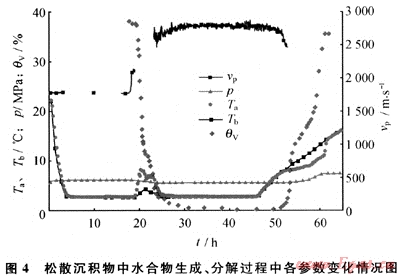 松散沉積物為采自于青島海邊的天然砂,粒徑為0.18~0.25mm,其物質(zhì)成分及含量如表2所示。由于難以探測松散沉積物的橫波速度,本文實驗僅獲取了縱波速度隨水合物生成和分解的變化情況(圖4)。結果表明,水合物剛開始生成時,縱波速度有一個陡然增大的現(xiàn)象,隨后由于超聲衰減極大,縱波速度難以獲取[13]。水合物完成生成時,含水合物松散沉積物的縱波速度為278m/s左右,比含飽和水沉積物的聲速增長1000m/s左右。