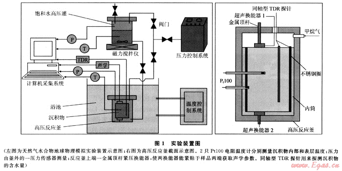實驗在青島海洋地質(zhì)研究所水合物實驗室地球物理模擬實驗裝置上進行,該裝置主要由高壓反應釜及內(nèi)筒、溫控系統(tǒng)、壓力控制系統(tǒng)、測試系統(tǒng)(包括超聲探測和時域反射探測)和數(shù)據(jù)采集系統(tǒng)5大功能模塊組成(圖1)。實驗過程為:在高壓反應釜中模擬海底真實的溫度壓力條件,使水合物在沉積物中形成,同時采用超聲探測技術和時域反射技術(TDR,Time Domain Reflectometry)實時探測全過程中沉積介質(zhì)的聲學參數(shù)和水合物飽和度。為加快水合物生成進程,實驗采用300mg/L的SDS(十二烷基硫酸鈉)溶液和99.99%甲烷生成水合物。實驗的詳細介紹見本文參考文獻[8]、[9]。