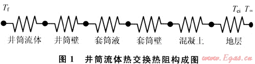 圖1顯示了井筒流體與地層間熱交換最全面的熱阻構(gòu)成??倐鳠嵯禂?shù)U或熱阻R,由6項(xiàng)串聯(lián)組成:①井筒內(nèi)流體的對(duì)流換熱;②井筒壁的熱傳導(dǎo);③井筒與套管間環(huán)形空間套筒液的對(duì)流換熱;④套筒壁的熱傳導(dǎo);⑤混凝土的熱傳導(dǎo);⑥地層的熱阻。