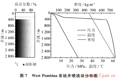 以上述West Pembina系統(tǒng)為例,如果流動(dòng)處于開口狀態(tài),即井口壓力為101.325kPa,通過GLEWpro分析可知,該井噴流動(dòng)在井口達(dá)到臨界狀態(tài),其壓力為521kPa、速度為290m/s、流量為23.62×103m3/a,在300m深時(shí)流動(dòng)從液相轉(zhuǎn)變?yōu)闅庀?,如圖7所示。