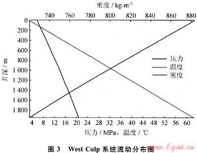 該例計(jì)算Anderson West Culp酸氣回注系統(tǒng)井筒底部壓力和井筒流動(dòng)分布[6]。該井筒為Ø60.325mm管(ID=50.673mm,壁厚4.826mm)垂直1943m深,酸氣組成H2S為60%,CO2為39%,C1為1%。在回注流量為0.6MMSCFD和井口在5.8MPa和3℃的情況下,GLEWpro估計(jì)井壓力是21.04MPa,這與本文參考文獻(xiàn)[6]測(cè)量的20.2MPa非常接近。圖3顯示了沿井筒的壓力、溫度和密度分布。