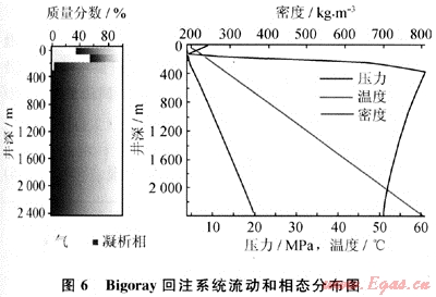 回注井深2396m,井筒為Ø60.325mm管,井底壓力和溫度是20.4MPa和61℃,要注入5℃的7.1×103m3/d的酸氣混合物(9.2%的H2S、89.8%的C02和1%的CH4)。GLEWpro估計(jì)的回注壓力是3.91MPa,與本文參考文獻(xiàn)[7]所報(bào)告的4.056MPa非常接近。本文參考文獻(xiàn)[7]指出在距井口239.4m左右流體從多相轉(zhuǎn)變?yōu)橥耆合啵珿LEWpro顯示這個(gè)轉(zhuǎn)變發(fā)生在250m處,流動(dòng)和相態(tài)分布見圖6。