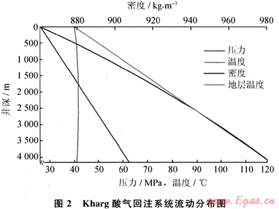 在整個(gè)井筒酸氣都處于液相,計(jì)算的井口回注壓力為26.39MPa(263.9bar),井底流體的溫度是40.9℃。沿井筒的壓力、溫度和密度分布顯示在圖2。