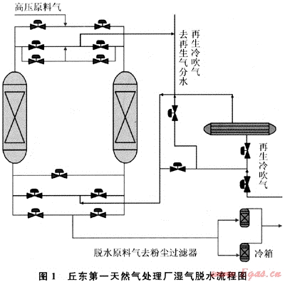 原料氣進(jìn)裝置區(qū)后首先進(jìn)入分離器除去游離水和機(jī)械雜質(zhì),然后在6.5MPa、25℃條件下進(jìn)入分子篩干燥器,脫水后干氣露點(diǎn)小于-80℃,干氣進(jìn)入旋風(fēng)分離器除去分子篩粉末,最后進(jìn)入輸氣管線(xiàn)。流程如圖1所示: