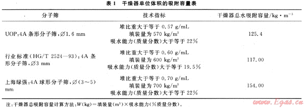 選用不同堆比重分子篩的條件下,干燥器單位體積的吸附容量見(jiàn)表1。