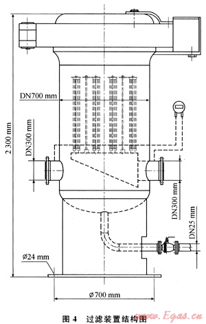 4) 改進(jìn)過(guò)濾裝置,采用HFB/150天然氣高效沉降過(guò)濾器,該裝置過(guò)濾器由沉降段及過(guò)濾段兩部分組成,沉降段由分隔板構(gòu)成一個(gè)重力沉降室;過(guò)濾段安裝有若干只濾芯。當(dāng)含塵氣體進(jìn)入分離器時(shí),在重力作用下先將粗顆粒雜質(zhì)分離,從而減輕了后續(xù)精密濾芯的負(fù)荷,較細(xì)的雜質(zhì)則隨著氣體由過(guò)濾段的濾芯除去,最終氣體得以?xún)艋?。改進(jìn)后的過(guò)濾器裝置結(jié)構(gòu)圖見(jiàn)圖4。