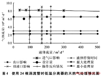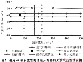 由圖5可知,在壓力為4.0MPa時,44根渦流管的處理量為(410~550)×104m3/d,由此看來造成外輸商品氣氣質不合格的主要原因是渦流管的數(shù)量不夠。