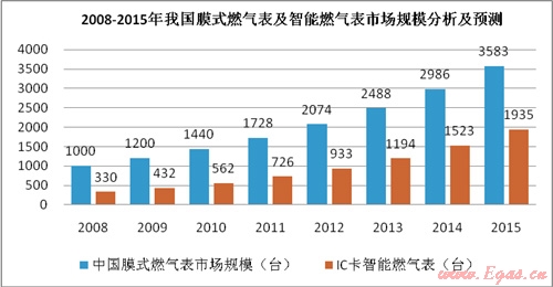 根據(jù)中國計量協(xié)會的相關(guān)數(shù)據(jù),我國目前約有100家燃氣表廠,2008年總產(chǎn)量為1000萬臺,每年的復合增長率約為20%。具有中國特色的智能膜式燃氣表,以IC卡預(yù)付費為主導產(chǎn)品,總量逐年上升,已占膜式燃氣表總量的30%以上。預(yù)計2015年我國燃氣表總產(chǎn)量為3583萬臺,智能燃氣表總產(chǎn)量為1935萬臺。